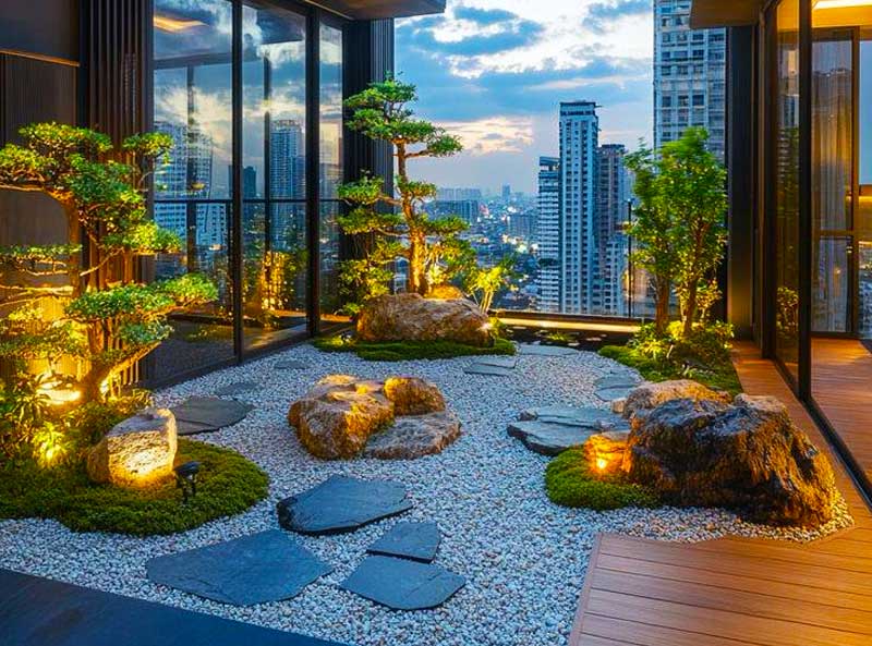 Bonsai, tùng, liễu Nhật hay những cây dáng thơ chính là linh hồn của sân vườn Nhật. Rọi sáng từ dưới lên (up-light), hoặc ánh sáng nhỏ tại từng tán cây sẽ tạo hiệu ứng chiều sâu tuyệt đẹp.