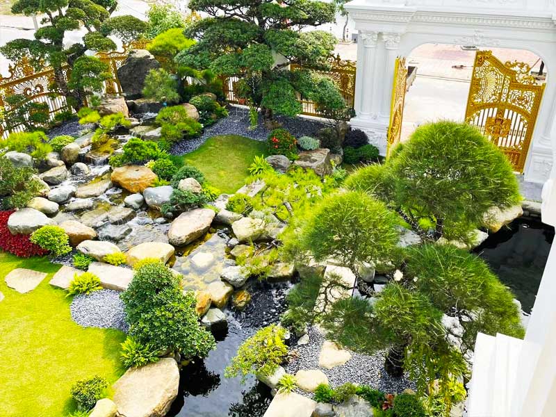 Một hòn non bộ được tạo dựng tỉ mỉ từ đá tự nhiên, phía trên là một thác nước nhỏ róc rách chảy xuống hồ, mô phỏng lại cảnh quan núi non hùng vĩ thu nhỏ. Xung quanh đó là những cây tùng La Hán cổ thụ được cắt tỉa cầu kỳ theo hình dáng thác đổ hay mây trời, tạo nên sự hài hòa và cân đối cho tổng thể.