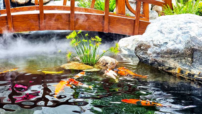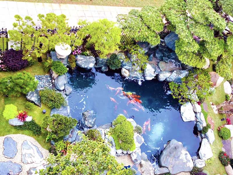 - Hồ Koi và thác nước nhân tạo: Đại diện cho hồ, suối và sự sống, điểm nhấn trung tâm, vừa tạo sinh khí vừa mang ý nghĩa may mắn, tài lộc. Tiếng nước chảy róc rách, mặt hồ tĩnh lặng soi bóng mây trời mang lại cảm giác thư thái và bình yên