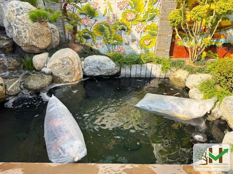 Điểm nhấn nổi bật của dự án là tiểu cảnh hồ nước kết hợp thác đá tự nhiên được bố trí ở góc sân.