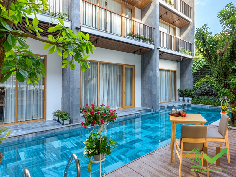Hồ bơi biệt thự được thiết kế ở sau nhà, đi kèm với bố trí cây xanh và bàn trà phong cách hiện đại. Thiết kế hồ bơi biệt thự phù hợp với các căn biệt thự có diện tích phía sau khiêm tốn.