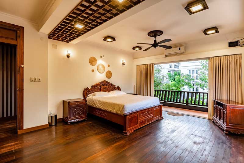 Tầng 2 gồm 4 phòng ngủ khép kín, bài trí đơn giản để tối ưu không gian. Các phòng đều có cửa sổ lớn giúp gia chủ có thể ngắm trọn vẹn cảnh biển bên ngoài và khu vườn bên trong, đồng thời lấy sáng, đón gió hiệu quả vào trong nhà. Một số chi tiết trang trí làm từ mây tre đan mang đến cảm giác về một không gian thân thuộc như ở làng quê.