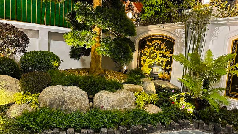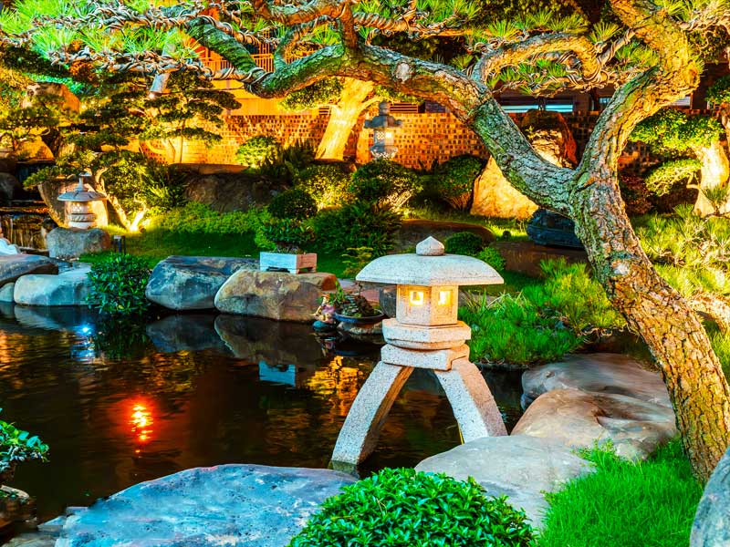 Bonsai, tùng, liễu Nhật hay những cây dáng thơ chính là linh hồn của sân vườn Nhật. Rọi sáng từ dưới lên (up-light), hoặc ánh sáng nhỏ tại từng tán cây sẽ tạo hiệu ứng chiều sâu tuyệt đẹp.