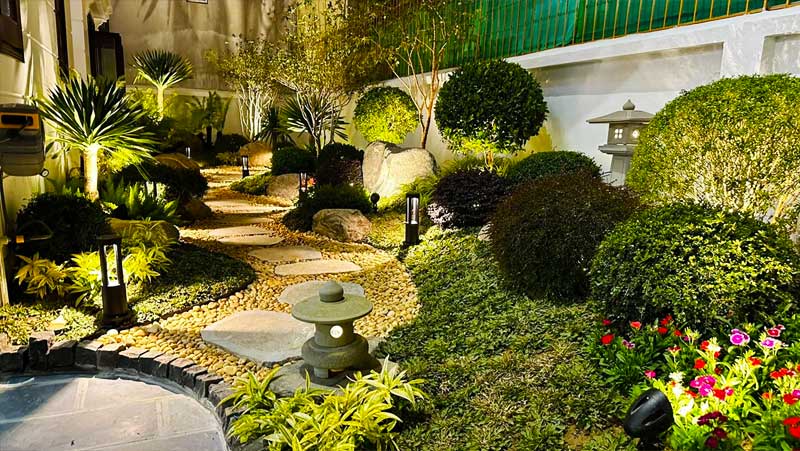 Trong sân vườn Nhật, lối đi thường uốn lượn theo triết lý “khuất – hiện” tạo cảm giác khám phá. Bố trí đèn lối đi là cách vừa làm nổi bật đường nét đó, vừa đảm bảo an toàn khi di chuyển về đêm.