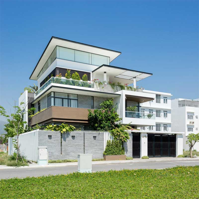 Mặt tiền được thiết kế bất đối xứng, tạo ấn tượng về thị giác. Một số phần tường được sơn trắng kết hợp chất liệu kính ở lan can, cửa sổ giúp bắt sáng, nới rộng chiều sâu và cao cho căn biệt thự. Cây xanh và hoa vừa giúp che nắng hiệu quả, vừa nâng cao tính thẩm mỹ của công trình.