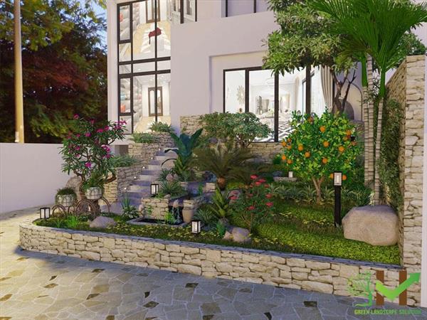 Một vườn hoa nhỏ trước hiên nhà thôi nhưng mang lại bao tiện ích cho gia chủ. Cây xanh được phân cấp theo tầng dạng bậc thang, phía trên là cây cao tạo bóng mát, hàng cây cau sát tường mang lại cảm giác yên ả của đồng quê. Hoa và các cây bụi phân bổ phía dưới tạo lên một quần thể hoàn hảo. Đèn trang trí hiện đại quanh vườn và dọc lối lên nhà sẽ tỏa ánh sáng lung linh khi màn đêm buông xuống tạo lên khung cảnh thật lãng mạn...