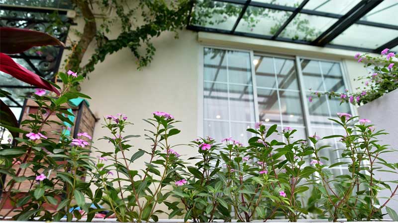 Cây xanh và hoa được trồng bao quanh ngôi nhà