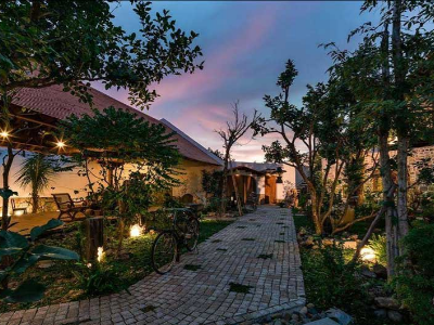 Lối đi vào được lát đá, phân chia công trình thành hai khối nhà chính – phụ