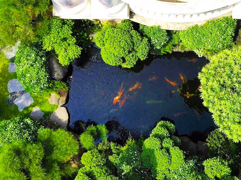 - Hồ Koi và thác nước nhân tạo: Đại diện cho hồ, suối và sự sống, điểm nhấn trung tâm, vừa tạo sinh khí vừa mang ý nghĩa may mắn, tài lộc. Tiếng nước chảy róc rách, mặt hồ tĩnh lặng soi bóng mây trời mang lại cảm giác thư thái và bình yên
