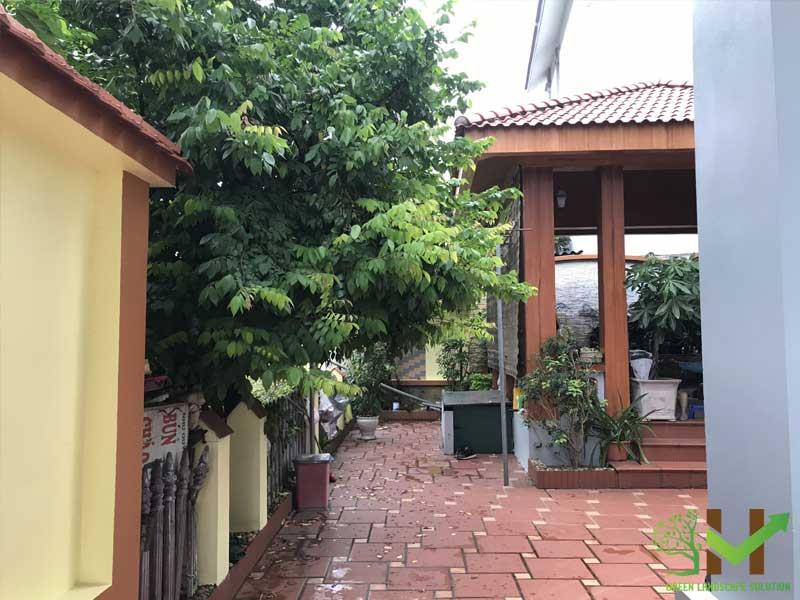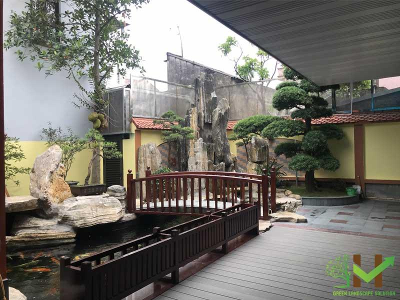 Từ một khoảng sân vườn chỉ toàn cây ăn quả, rau, cây cảnh vô cùng lộn xộn đã được vuonhoa.vn "hô biến" thành một bể bơi xanh mát lịm, hồ Koi có những chú cá nhiều màu sắc tung tăng bơi lội với chiếc cầu gỗ cong cong mềm mại. Nổi bật giữa thảm thực vật xanh là bức tranh được đắp công phu màu đồng hoài cổ mang giá trị nghệ thuật rất cao.