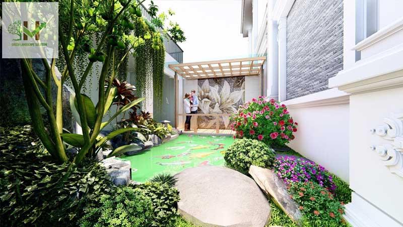 Hồ cá Koi xếp đá là một hạng mục không thể thiếu của sân vườn, nó được làm nổi bật với nhiều tiểu cảnh kết hợp như đèn đá, non bộ, cầu gỗ... đặc biệt hàng liễu rủ xuống mặt hồ làm những tảng đá xù xì thô cứng trở lên mềm mại tạo cảm giác thư thái cho gia chủ và bạn bè quan khách khi thư giãn ở đây.