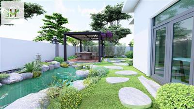 Ngược lại, phía bên phải diện tích rộng đủ để gia chủ có thể mang cả thế giới giải trí, thư giãn đến cho gia đình. Bước ra vườn bạn có thể đi chân trần để thảm cỏ xanh mượt mà mát xa đôi chân đang mỏi hay nhảy nhót trên những phiến đá mát lạnh cả tâm hồn kia.