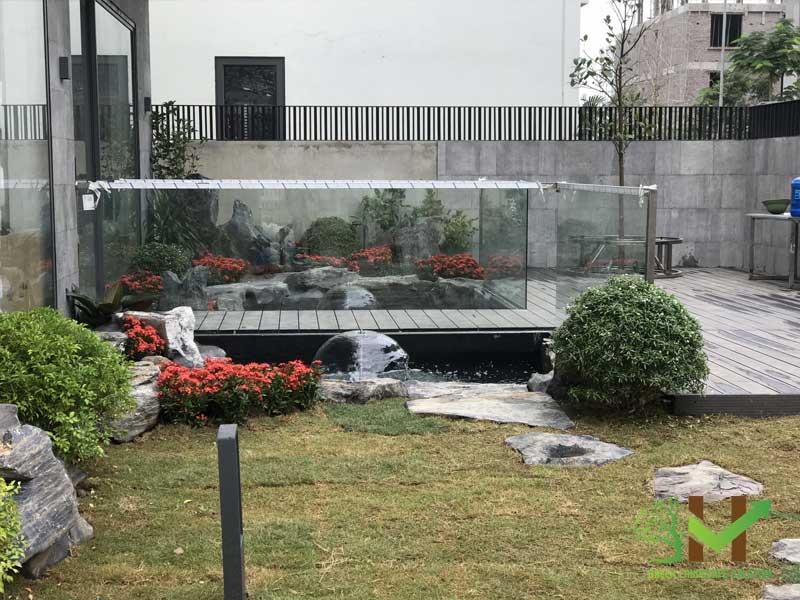 Cảnh quan sân vườn, hồ cá Koi được vuonhoa.vn thiết kế đều rất đơn giản nhưng lại làm cho căn biệt thự trở lên sang trọng hơn, thể hiện được phong cách riêng của gia chủ không ồn ào, phô trương mà lại vô cùng đẳng cấp.