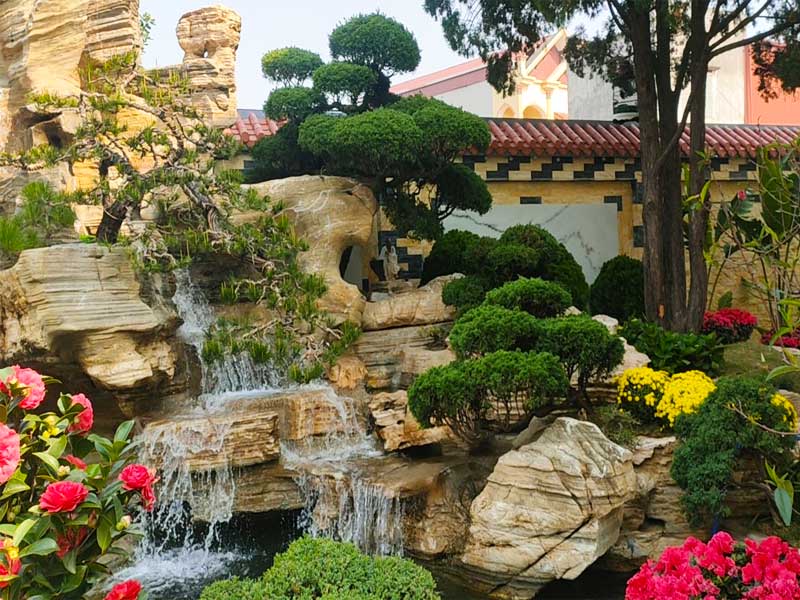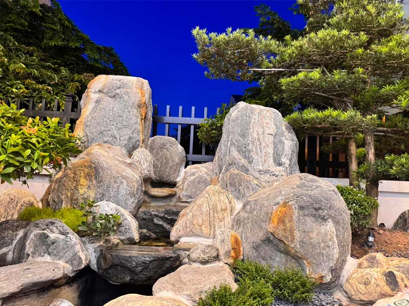 Trong các dự án tiểu cảnh sân vườn, chúng tôi sử dụng những khối đá để tạo nên các tiểu cảnh khô mô phỏng sa mạc đá, hay các tiểu cảnh nước với những dòng suối nhỏ, những thác nước êm đềm. Mỗi tác phẩm đều là một câu chuyện, một bức tranh phong cảnh có chiều sâu và cảm xúc.